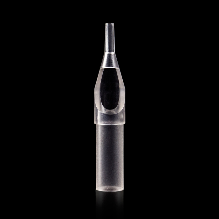 Eine 50er Box von 50 Killer Ink PREMIUM transparenten Einwegspitzen, rund. Die Spitzen sind einzeln steril eingeblistert. Transparente Spitze ermöglicht verbesserte Kontrolle über Nadeln und Farben.
