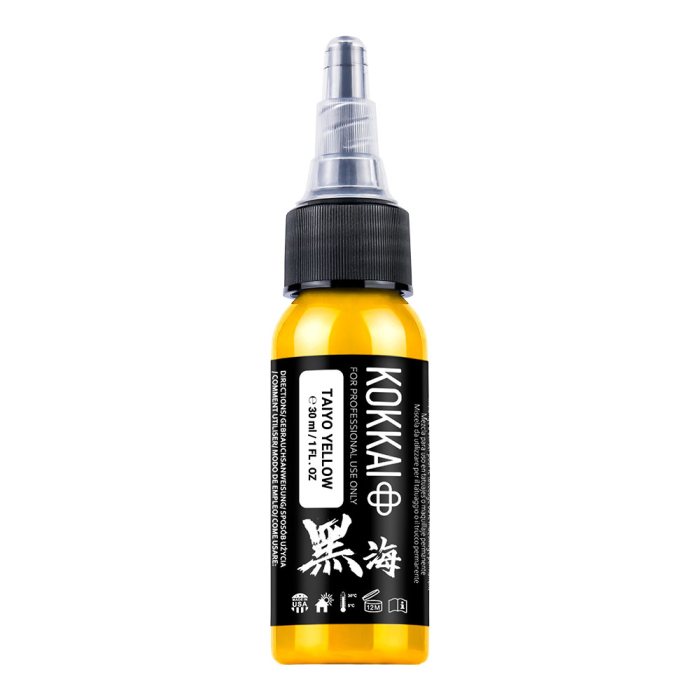 Illuminate your tattoos with Kokkai Sumi Ink in Taiyo Yellow, a bold, bright yellow perfect for striking highlights, vibrant accents, and bold colour fills. Maintains its brightness over time for long-lasting results.
