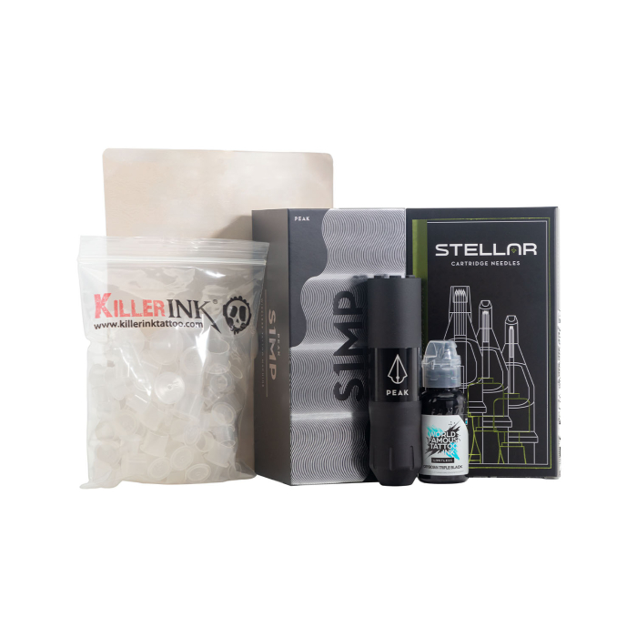 Enthält eine stiftähnliche Tattoo-Maschine mit kabellosem Akkupack, schwarzer Farbe und Farbkappen, Nadelmodulen sowie einem Blatt Übungshaut, sodass Sie sofort mit dem Üben beginnen können. Alles in diesem Kit wird einzeln auf der Killer Ink-Website verkauft, sodass Sie es bei Bedarf nachfüllen können.