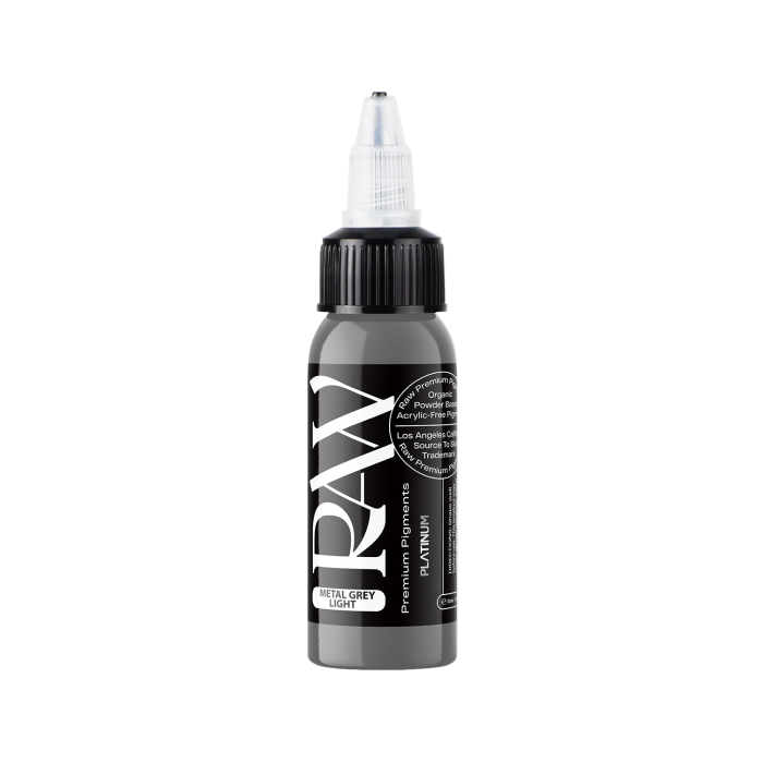 Metal Grey Light ist eine sehr weiche graue Tattoo-Farbe, die aufgehellt oder abgedunkelt werden kann und leicht in die Haut eindringt, aus der EU REACH-konformen Platinum-Reihe von Raw Premium Pigments.